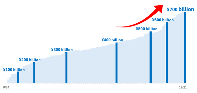 The SBI Hyper Yokin, launched on September 23, 2025, in collaboration with SBI Securities, has been widely adopted by customers since its inception. Furthermore, thanks to the “Aim for ¥1 Trillion! Interest Rate Up to 10 Times Campaign” (please check the campaign page for detailed conditions) that began on December 10, 2025, the pace of balance growth has accelerated significantly. Following this campaign, SBI Hyper Yokin’s balance surpassed ¥600 billion on December 12 and continued its rapid climb, increasing by more than ¥100 billion in just nine days to reach ¥700 billion by December 21. The net increase in December alone has reached about ¥240 billion.
