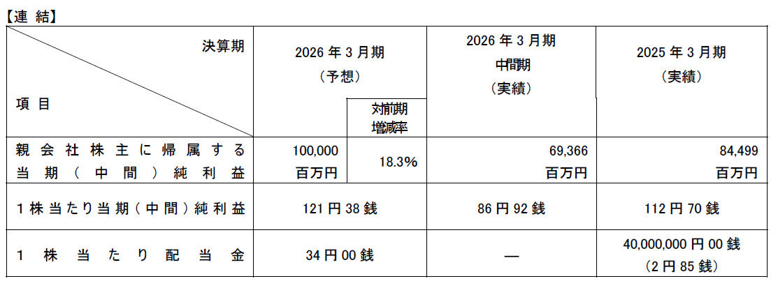 以上の結果、2026 年3月期の親会社株主に帰属する当期純利益は、前期比18.3%増の100,000 百万円を見込んでおります。