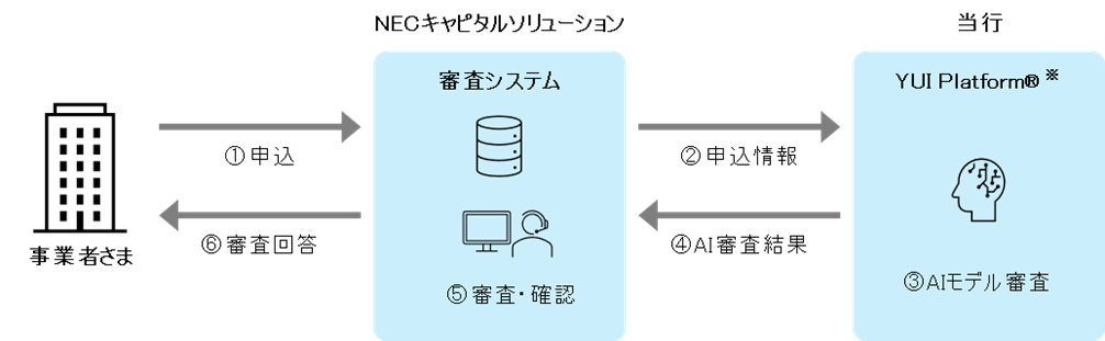 このたび、SBI新生銀行が開発したAI審査ロジックと、NECキャピタルソリューションの豊富な審査ナレッジとを組み合わせることで、SBI新生銀行グループの統合AIプラットフォーム「YUI Platform®」※上に独自の与信審査モデルを構築しました。この与信審査モデルをNECキャピタルソリューションの「小口リース」の与信審査業務に適用することにより、審査業務の約20%を自動化するとともに、審査精度の向上と、回答までに要する期間の短縮化を図るものです。今後も、さらなる改善を進めてまいります。