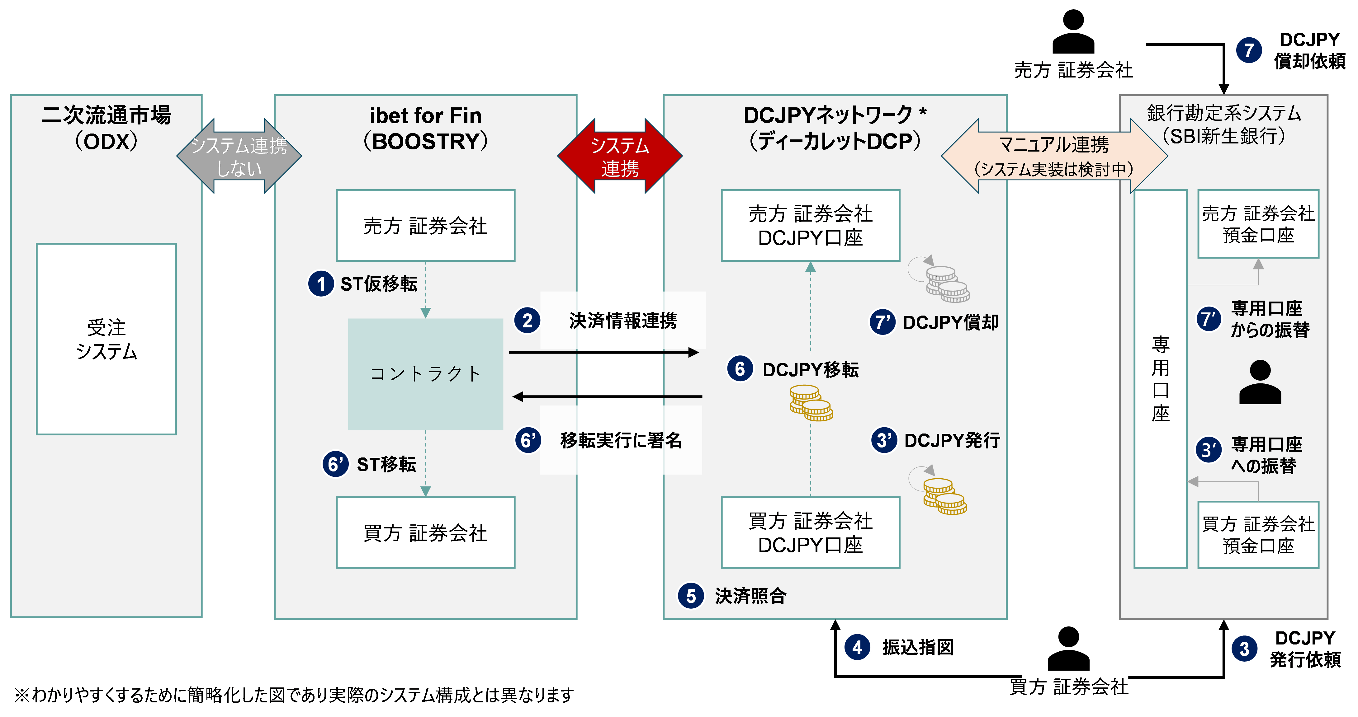 株式会社SBI証券(代表取締役社長:髙村 正人、以下「SBI証券」)、大和証券株式会社(代表取締役社長:荻野 明彦、以下「大和証券」)、株式会社SBI新生銀行(代表取締役社長:川島 克哉、以下「SBI新生銀行」)、株式会社BOOSTRY(代表取締役社長:平井 数磨、以下「BOOSTRY」)、大阪デジタルエクスチェンジ株式会社(代表取締役社長:朏 仁雄、以下「ODX」)、株式会社ディーカレットDCP(代表取締役会長兼社長執行役員CEO:村林 聡、以下「ディーカレットDCP」)は、セキュリティトークン(以下「ST」)1の二次流通市場の発展に向けた新たな決済スキームを実現するべく、トークン化預金DCJPY(以下「DCJPY」)を利用したSTのDVP2決済の実証(以下「本プロジェクト」)に関する協業を開始しました。本プロジェクト関係者は、2025年8月に、検証用データを用いたSTとDCJPYのDVP決済の検証を実施し、STの二次流通時を想定したDVP決済に係るシステムイメージと業務フローの整理を概ね完了しております。今後、STおよびDCJPYの実発行による検証に取り組んで参ります。