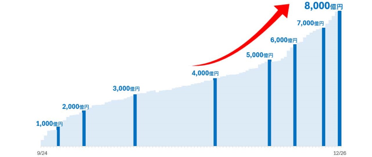 また、当行は2026年1月9日からSBIハイパー預金の通常金利を年0.42%(税引後 年0.3346%)から年0.50%(税引後 年0.3984%)へ引き上げること、および同キャンペーンの最大金利を年5.0%相当(税引後 年3.9842%)へ引き上げることを、12月22日に発表いたしました。 これにより、お客さまの関心が一段と高まり、7,000億円突破から5日間で1,000億円以上の増加となっております。